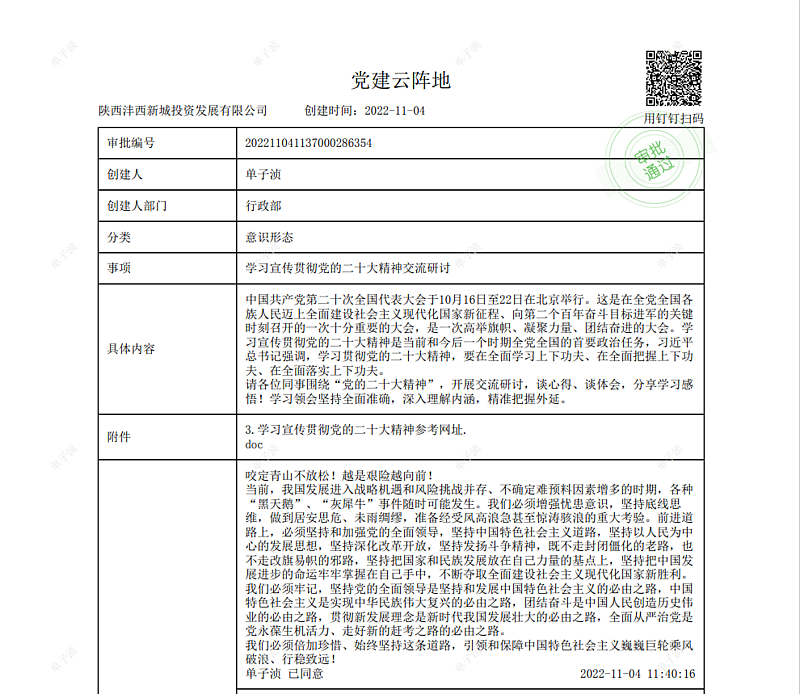 “我來(lái)說(shuō)說(shuō)黨的二十大報(bào)告里的關(guān)鍵詞—‘團(tuán)結(jié)’,團(tuán)結(jié)奮斗是我們黨過(guò)去取得成功、現(xiàn)在爭(zhēng)取成功、將來(lái)繼續(xù)成功的寶貴經(jīng)驗(yàn),是中國(guó)共產(chǎn)黨百年光輝歷程的主旋律,”這是灃西投資黨支部在釘釘黨建云平臺(tái)上發(fā)起的一場(chǎng)二十大理論“微宣講”活動(dòng)的交流討論。“微宣講”是創(chuàng)新宣講活動(dòng)的一次有益嘗試,灃西投資黨支部不斷拓寬宣講渠道,在鞏固宣講人員線下+多媒體宣講的前提下,發(fā)揮網(wǎng)絡(luò)渠道宣講不受時(shí)間、地點(diǎn)限制的優(yōu)勢(shì)。除線下面對(duì)面、點(diǎn)對(duì)點(diǎn)宣講外,在釘釘黨建云平臺(tái)、微信交流群發(fā)起系列宣講學(xué)習(xí)交流討論活動(dòng),不斷擴(kuò)大宣講覆蓋范圍和感染力,讓大家能入腦、入心、可落實(shí)、聚人氣。