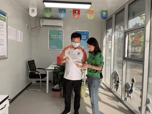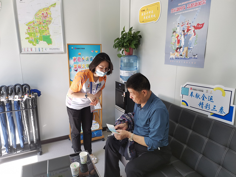 志愿者賀欣執勤時恰逢中秋佳節,雨后天晴、陽光明媚的上午,一位花甲老人走進了西部云谷二期站志愿者崗亭,老人問到:“在哪里可以取十四運會比賽的票啊?”賀欣看到老人趕緊讓他先坐下休息,詢問了具體情況,拍下了取票碼,與一同執勤的志愿者胡穎前往附近取票點幫老人領取了次日觀賽門票,交到了老人手中。交談過程中,得知老人不了解觀賽注意事項時,賀欣主動為老人下載了全運通APP,并逐一介紹了如何使用。這時,老人的老伴來電話詢問是否取到票時,老人流露出慈祥的表情贊許到:“多虧了灃西新城這里的十四運會城市志愿者,票已經取到啦,比你娃管用!”賀欣談到,“這是全運會第一次走進西北地區,作為土生土長的西安人我感到無比驕傲,能成為‘小秦寶’的一員更是尤為自豪,我愿意將我的汗水揮灑在我愛的這片土地上。”