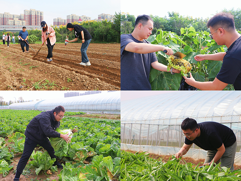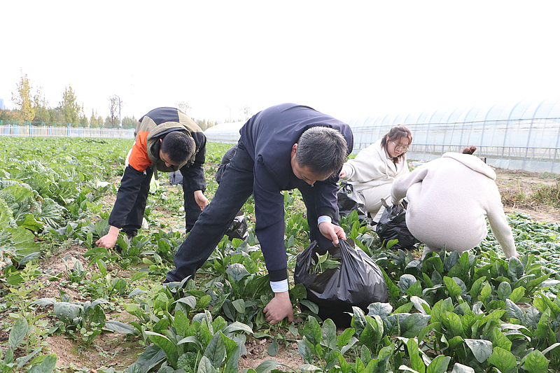 立冬過(guò)后,水嫩的蘿卜、翠綠的白菜、黃心的油菜等時(shí)蔬長(zhǎng)勢(shì)喜人,綠浪農(nóng)業(yè)公社的工作人員手持鐮刀向大家示范了采摘的方法技巧。隨后,團(tuán)員青年員工走進(jìn)田壟,或松土刨拔根蘿卜、或左右旋鈕摘白菜、或彎腰掐莖收油菜......一筐筐新鮮的蔬菜承載著豐收的喜悅,大家雖然雙手沾滿泥土,卻樂(lè)此不疲。