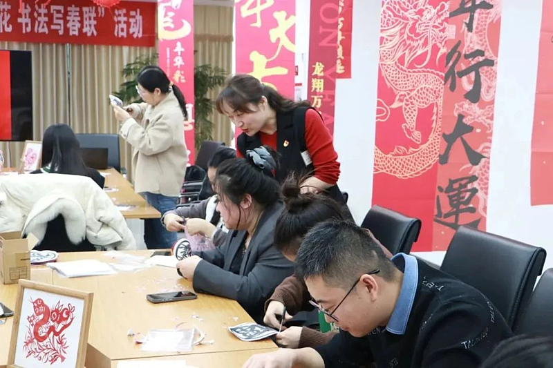 活動(dòng)現(xiàn)場,前來寫剪窗花、寫春聯(lián)的職工絡(luò)繹不絕。剪紙老師細(xì)致地為大家講解剪紙技巧,大家歡聚一堂,共同感受剪紙的樂趣,一剪一剪慢慢雕琢著“福”字和生肖“龍”,剪刀一起一落間紅色祝福灑落祥和。書法家鋪開紅卷,挽袖執(zhí)筆,筆走龍蛇,潑墨揮毫。“全家歡樂春來早,老少祥福慶壽高”“百花迎春福滿庭,萬事順意喜臨門”……一副副散發(fā)著清新墨香、飽含濃情與祝福的春聯(lián)躍然紙上,一字一墨賡續(xù)著傳統(tǒng)文化,紅紙黑字間映透著共同的祝福和心愿。活動(dòng)期間,幾輪有關(guān)“龍”文化的有獎(jiǎng)競猜活動(dòng)引得現(xiàn)場員工陣陣歡呼,現(xiàn)場呈現(xiàn)一片歡樂、祥和、喜慶的氛圍。