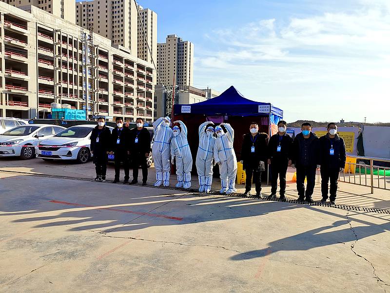 在房建項(xiàng)目現(xiàn)場(chǎng),由房建項(xiàng)目部19人組成疫情防控青年突擊隊(duì),赴一線開(kāi)展各項(xiàng)防疫工作,督促各參建單位啟動(dòng)疫情防控專項(xiàng)方案,協(xié)助醫(yī)護(hù)人員完成核酸采樣工作,并對(duì)每輪核酸檢測(cè)結(jié)果進(jìn)行統(tǒng)計(jì)、審核、報(bào)送。