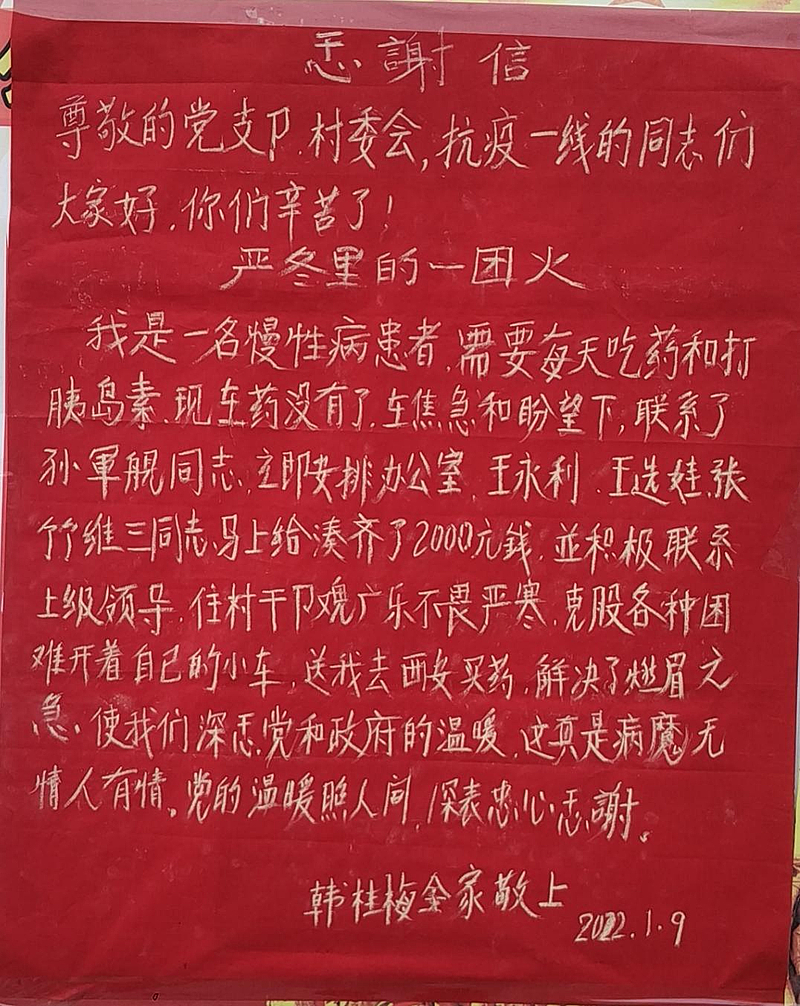 “還是我?guī)兔θメt(yī)院買藥吧,咱們也不能在這干著急呀!”韓桂梅老人行動不便,魏廣樂決定帶著熟悉老人病情的韓桂梅老伴去買藥,再叮囑家屬把身份證、需要購買的藥物清單、就診卡等攜帶齊全后,立即驅(qū)車前往西安交通大學(xué)第二附屬醫(yī)院。掛號、說明病情、拿藥……魏廣樂樓上樓下跑的滿頭大汗。忙了大半天,終于幫老人買到了所需的全部藥品,又幫忙辦理了慢性病報銷手續(xù)后,才帶著韓桂梅的老伴回到了村里。老人一直說著感謝的話,魏廣樂卻覺得這一切都是他應(yīng)該做的,安頓好老人之后,他又投入到了緊張的疫情防控工作當(dāng)中……