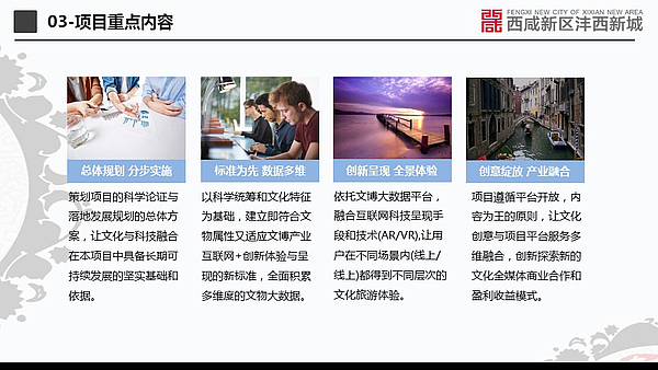 “西咸新區中華文明體驗式旅游云平臺”是打造“一帶一路”地區開放共享的統一文物信息資源平臺,通過對文物資源進行數字化開發挖掘,形成項目自有知識產權及IP版權,并對合作企業授權經營的具有示范性、帶動性和影響力的文化科技融合型數字化示范平臺項目。