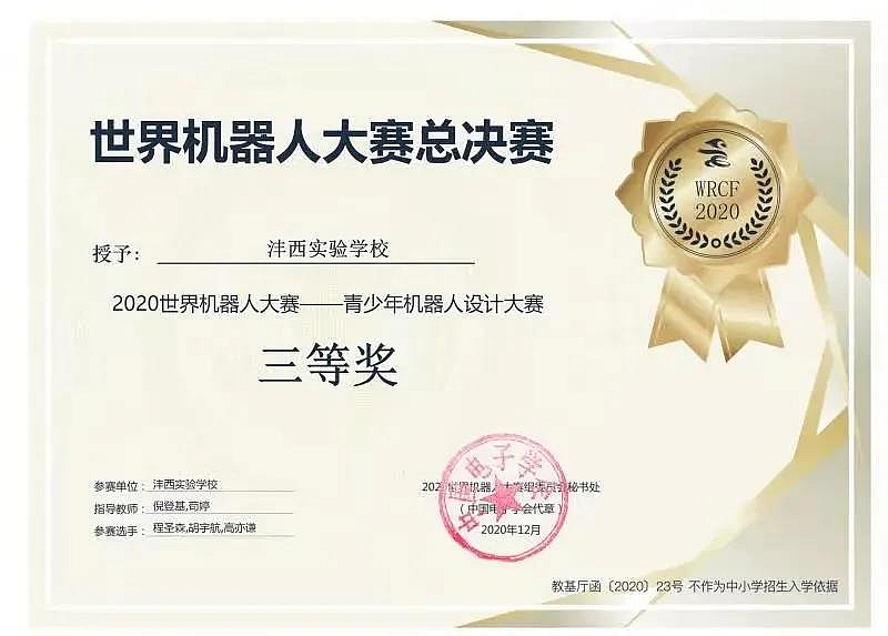 2020年12月,灃西實(shí)驗學(xué)校八年級學(xué)生胡宇航、程圣森、高奕謙榮獲2020世界機(jī)器人大賽總決賽三等獎。
