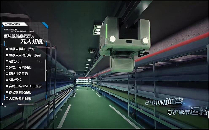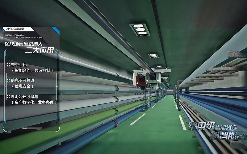 2020年8月,全球首個“區(qū)塊鏈+管廊機(jī)器人”智能巡檢監(jiān)測系統(tǒng)上線運(yùn)行,標(biāo)志著灃西新城綜合管廊開啟人工智能2.0時代。該系統(tǒng)利用區(qū)塊鏈技術(shù)去中心化、信息不可篡改、數(shù)據(jù)公開透明可追溯等天然優(yōu)勢,展現(xiàn)運(yùn)維過程的三大應(yīng)用場景。一是在中心服務(wù)器癱瘓情況下,巡檢機(jī)器人和滅火機(jī)器人觸發(fā)智能合約,在最短時間內(nèi)發(fā)現(xiàn)并有效消除火災(zāi);二是鏈上數(shù)據(jù)一旦生成,節(jié)點(diǎn)數(shù)據(jù)無法篡改,確保數(shù)據(jù)安全可靠;三是基于區(qū)塊鏈架構(gòu)的“GIS+BIM”數(shù)據(jù)共享至相關(guān)單位組成的聯(lián)盟鏈上,管線入廊手續(xù)辦理時間從1個月縮短至5個工作日,大大節(jié)省各項(xiàng)成本。升級的管廊機(jī)器人還具備自動充電、自動換電、智能變軌、拐彎爬坡、移動端管理、大數(shù)據(jù)分析等九大人工智能功能。