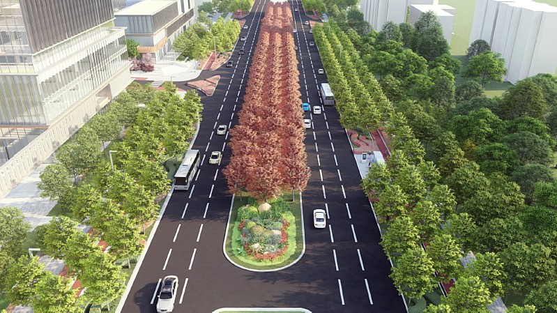 為城市主干路景觀配套,全長4公里,綠化面積約8萬平方米。該項目定位為科創、生態、活力街區示范區,主干道彰顯城市形象,次干道體現自然休閑,支路提供慢性體驗,打造簡約、大氣、自然的生態林蔭路。已于2023年2月開工進場,整理地形并栽植喬木,計劃于年底完成中分帶及部分側分帶綠化施工。