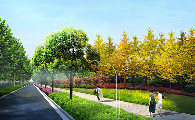 為城市主干路景觀配套,全長1.6公里,綠化面積約9萬平方米。該路段通過栽植高大喬木法桐、油松、國槐等鄉土樹種,端頭點綴組團植物群,致力于構建自然生態的植物景觀,營造休閑舒適的品質街景。計劃于2023年完成相關區域地形整理及綠化栽植施工。