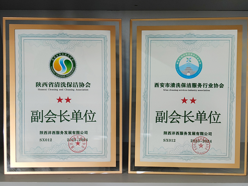 灃西服務:獲“陜西省清洗保潔協會副會長單位”“西安市清洗保潔服務行業協會副會長單位”授牌