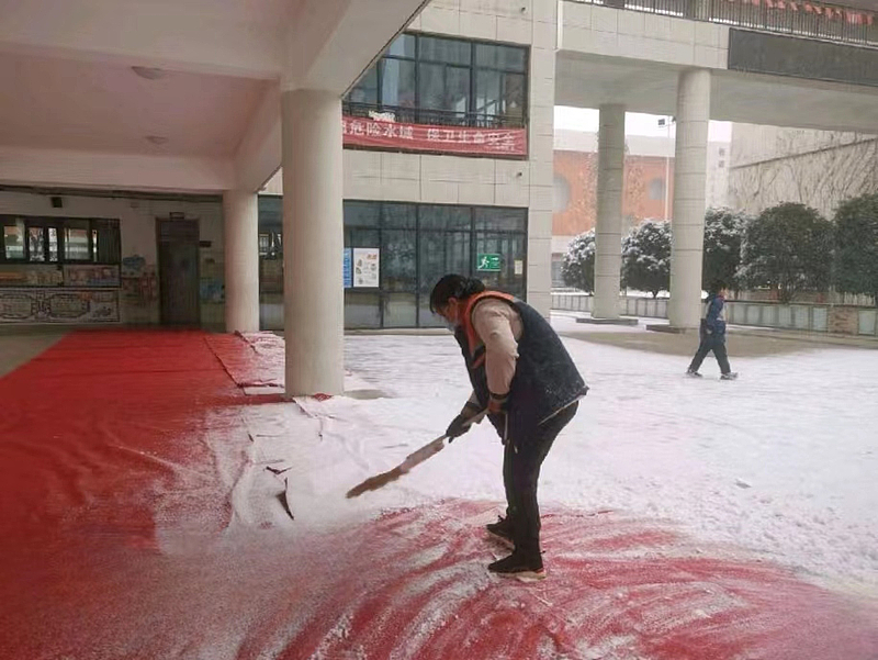 作為校園服務管家,片區工作動態性強,每一項服務都有很強的時效性要求,特別是一些突發天氣情況。1月16日,2024年第一場大雪如期而至,服務公司學校片區迅速組織各業務口工作人員開展除雪保暢活動。大家齊心協力,合作分工,在教學樓各大廳門口鋪設防滑墊,使用干拖布及時打掃腳底帶入的水漬,防止有學生因地面濕滑而摔倒,并迅速清理出校園主干道。第二日上班前,再次將校內有薄冰的地方和道路殘留積雪進行細致清理,全力確保師生方便通行,保障校園安全。