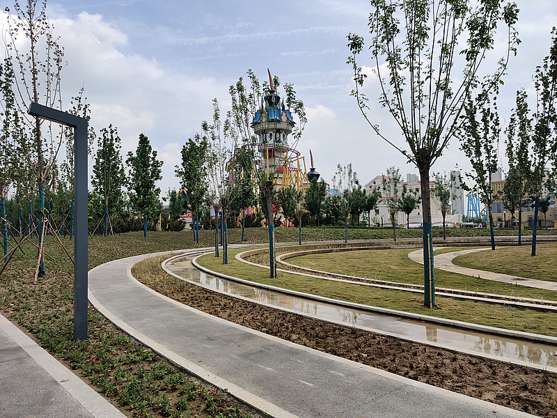 興科路東側(cè)林帶。項(xiàng)目位于灃西新城核心區(qū)地鐵五號(hào)線沿線、絲路歡樂(lè)世界以西,面積約7.1萬(wàn)平方米。作為絲路歡樂(lè)世界外圍展示窗口,項(xiàng)目景觀風(fēng)格融合絲路文化氛圍,設(shè)計(jì)多樣化服務(wù)功能,依托臨街界面打造藝術(shù)亮點(diǎn),形成綠色生態(tài)、開(kāi)放共享的林蔭街景,不僅為游樂(lè)場(chǎng)地打造了特色入口景觀,更為周邊群眾提供了多功能綠色休閑空間。