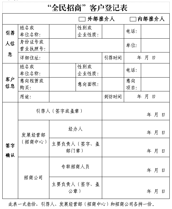 (三)客戶首次到訪,引薦人要與客戶同時到場,招商公司和專職招商人員需在《“全民招商”客戶登記表》簽字蓋章確認(rèn)客戶為首訪。