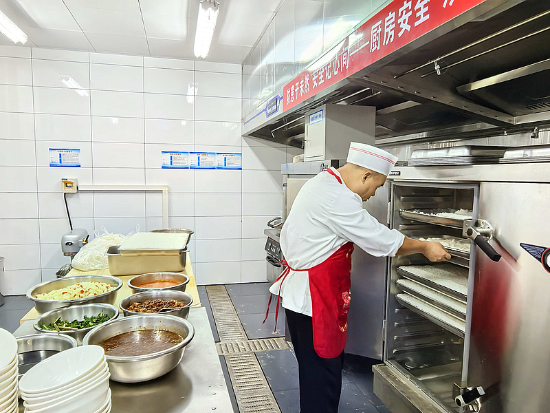 走進餐廳,映入眼簾的是明亮干凈的就餐環境,桌椅擺放整齊,用餐氛圍舒適,后廚整潔有序,專業廚師團隊從食材挑選到烹飪出品,每道工序都嚴格把控,讓大家吃得更安心。