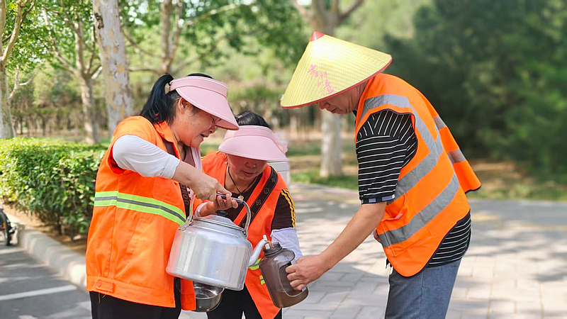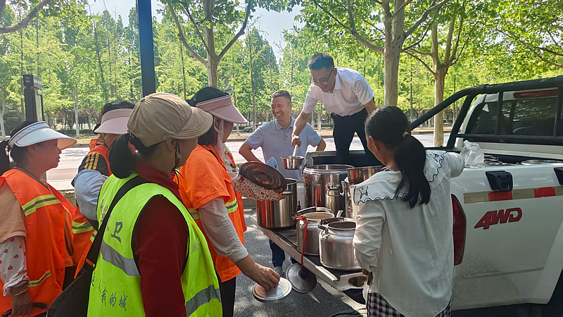 考慮到環衛工人分布廣、作業點分散的特點,除固定補給點外,灃西集團服務公司還安排專人駕駛三輪車穿梭于新城各個保潔區域,將一碗碗綠豆湯送到正在作業的環衛工人手中,確保每一位戶外勞作的“城市美容師”都能喝上一口清涼解暑的綠豆湯。