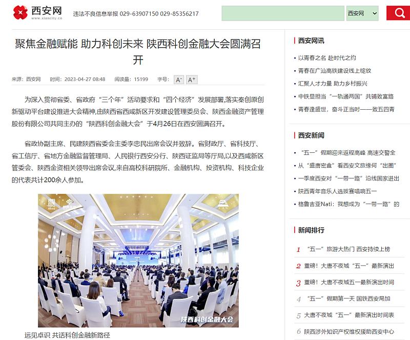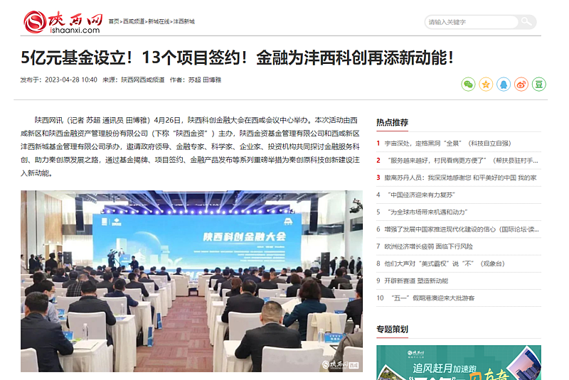 4月26日,陜西科創(chuàng)金融大會(huì)在西咸會(huì)議中心舉辦。本次活動(dòng)由西咸新區(qū)和陜西金融資產(chǎn)管理股份有限公司(下稱(chēng)“陜西金資”)主辦,陜西金資基金管理有限公司和西咸新區(qū)灃西新城基金管理有限公司承辦,邀請(qǐng)政府領(lǐng)導(dǎo)、金融專(zhuān)家、科學(xué)家、企業(yè)家、投資機(jī)構(gòu)共同探討金融服務(wù)科創(chuàng)、助力秦創(chuàng)原發(fā)展之路,通過(guò)基金揭牌、項(xiàng)目簽約、金融產(chǎn)品發(fā)布等系列重磅舉措為秦創(chuàng)原科技創(chuàng)新建設(shè)注入新動(dòng)能。